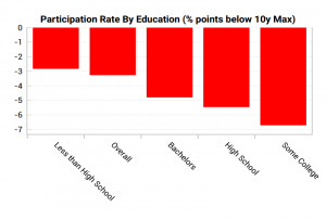 A college degree is also no longer a guarantee of employment. The drawdown in the participation rate for bachelor degree holders is higher than the least educated workers. This again speaks to the mis-match in skills asthe traditional education system becomes less suited to produce workers for the modern economy.