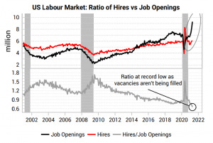 The US labor market has structural problems that are more significant than a headline unemployment rate nearing 5% would suggest. The skill mis-match narrative is visible in the data. The ratio of hires to job openings has collapsed.