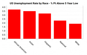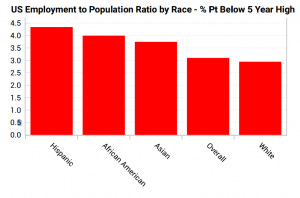 Employment inequality remains a key theme for the Fed. White employment outcomes remain significantly better than ethnic minorities. Ethnic minority unemployment rates are further from their lows. The employment to population ratio has also fallen further ethnic minorities vs white workers.