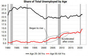 Older workers’ share of total unemployed continues to trend higher and has surged after each previous recession, consistent with a skill mis-match problem for older workers who need to adapt to the new economy.